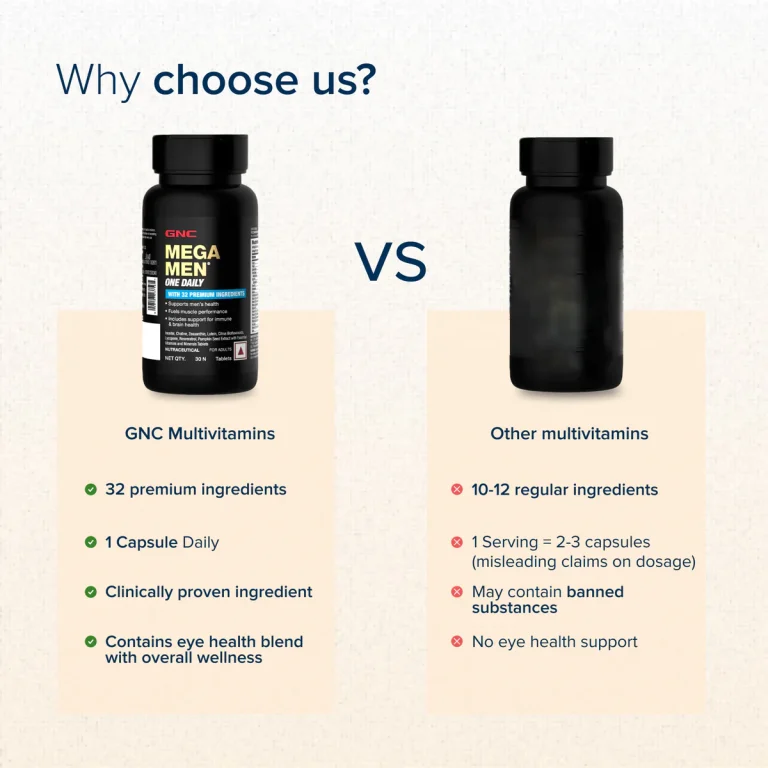 GNC Mega Men One Daily Multivitamin Tablet is formulated with 32 potent ingredients, including water-soluble vitamins, minerals, and other micronutrients along with special blends to give the body all the nourishment it needs to stay healthy and active. It contains inositol, choline, and zeaxanthin. Lutein, citrus bioflavonoids, lycopene, resveratrol, and pumpkin seed extract with essential vitamins and minerals help enhance immunity and boost muscle performance. The boron in this formulation strengthens the bones, citrus bioflavonoids provide antioxidant support and xanthein maintains eye health. The complementary effect of each ingredient in this formula supports brain function, protects vision, and promotes overall well-being.