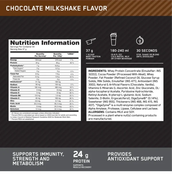 ON Performance Whey Chocolate Milkshake � packed with 24g of high quality complete protein per serving to help build muscle. Advanced blend of ultra-filtered and concentrated all-whey protein.